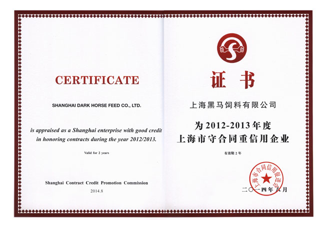 日前,我司榮獲2012-2013年度“上海市守合同重信用企業”榮譽稱號以及合同信用等級AAA證書,是上海市飼料行業少數幾家被授予AAA級信用的企業之一。這也是我司繼2008-2009年度以來,連續三次、6個年度獲此殊榮,成為連續兩次蟬聯此殊榮的佼佼者。